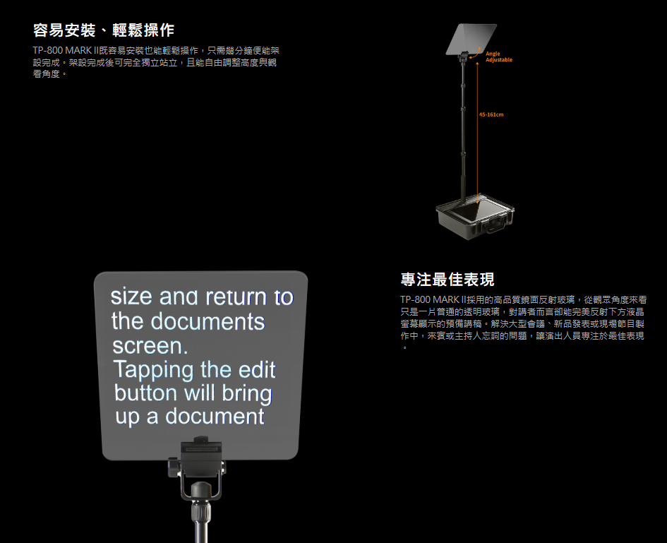 TP-800 MARK II採用的高品質鏡面反射玻璃,從觀眾角度來看只是一片普通的透明玻璃,對講者而言卻能完美反射下方液晶螢幕顯示的預備講稿。