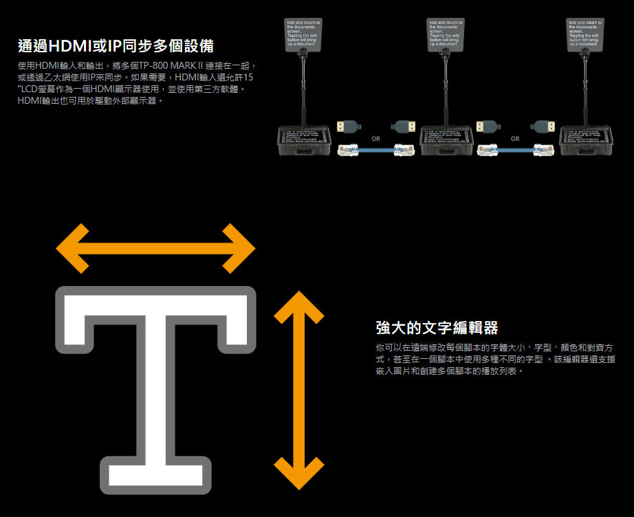 使用HDMI輸入和輸出,將多個TP-800 MARK II 連接在一起,或透過乙太網使用IP來同步。