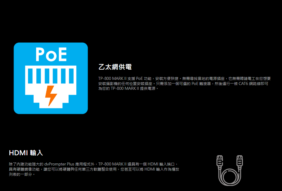 TP-800 MARK II 支援 PoE 功能,安裝方便快捷。