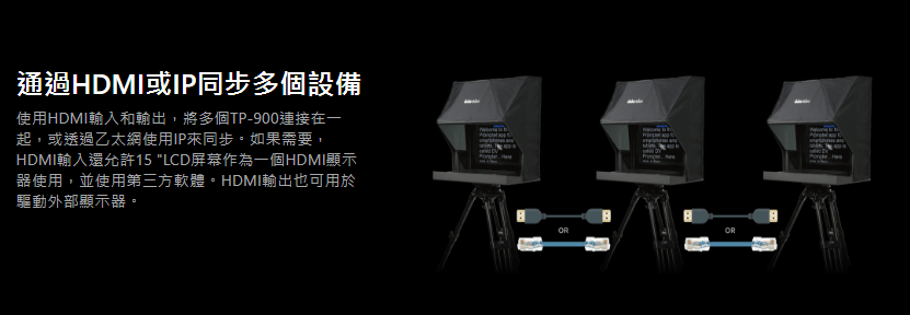 使用HDMI輸入和輸出,將多個TP-900連接在一起,或透過乙太網使用IP來同步。