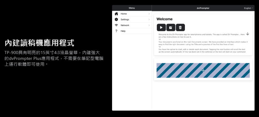 TP-900具有明亮的15英寸4:3液晶螢幕,內建強大的dvPrompter Plus應用程式,