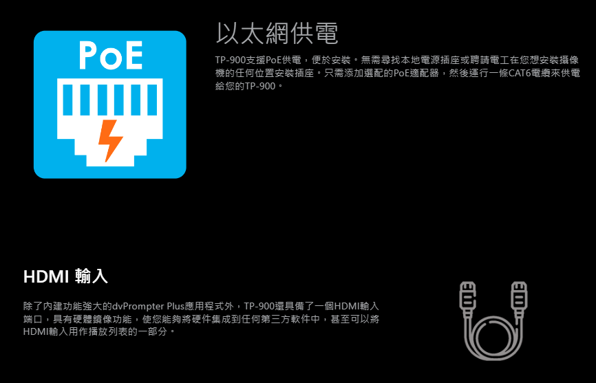 TP-900 高亮度 15 英寸螢幕並具有輸出鏡像功能,只需在攝影機和螢幕之間連接 HDMI 線材即可開始使用。