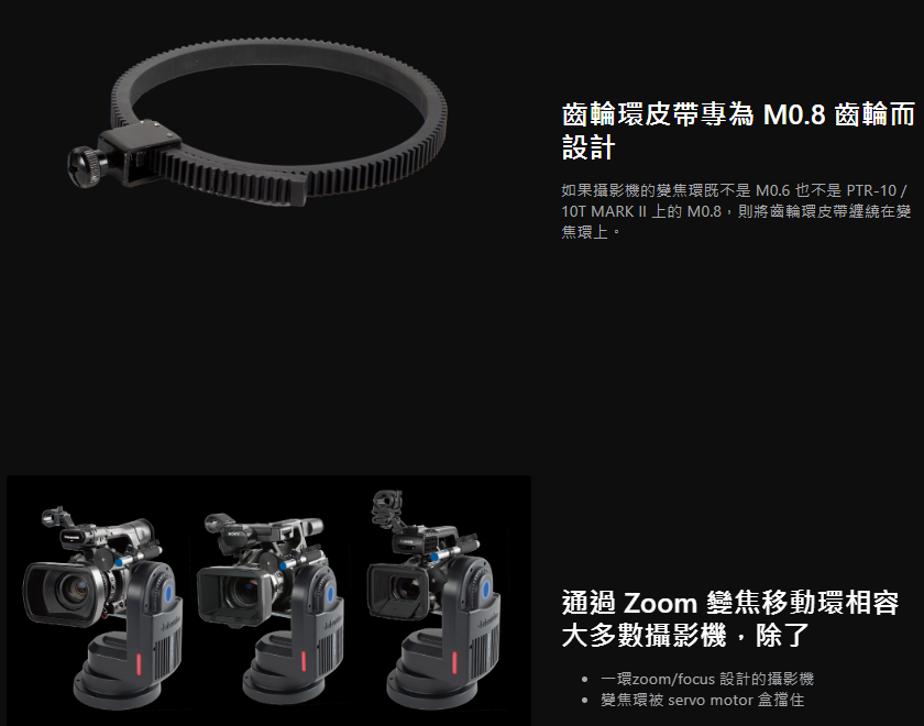 它可以與裝有 M0.8 齒輪的攝影機一起使用(通常是電影鏡頭),也可以與齒圈帶一起使用。