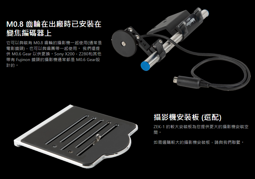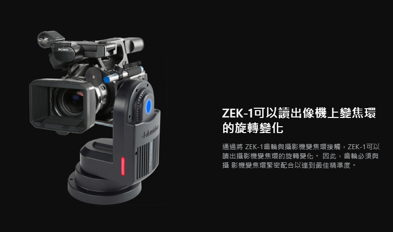 通過將 ZEK-1齒輪與攝影機變焦環接觸,ZEK-1可以讀出攝影機變焦環的旋轉變化。