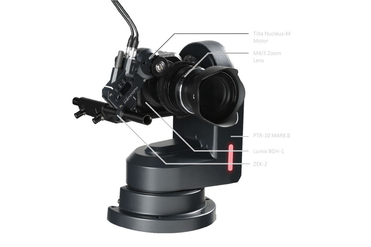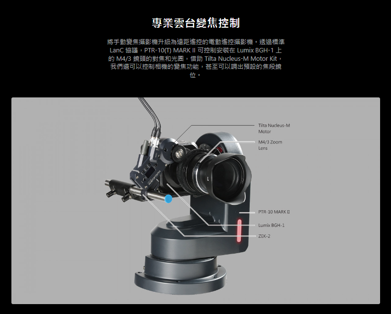 透過標準 LanC 協議,PTR-10(T) MARK II 可控制安裝在 Lumix BGH-1 上的 M4/3 鏡頭的對焦和光圈,