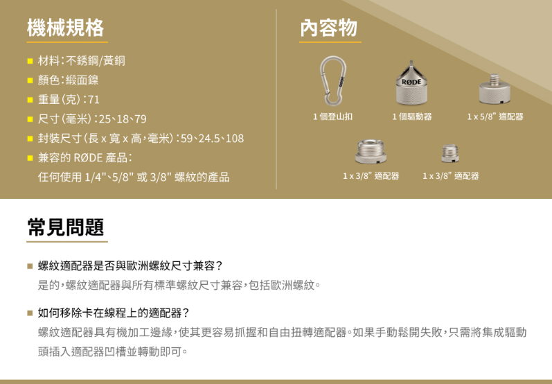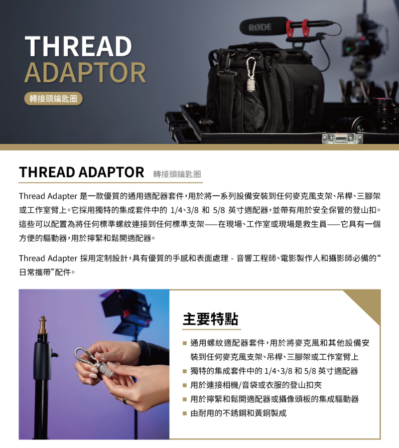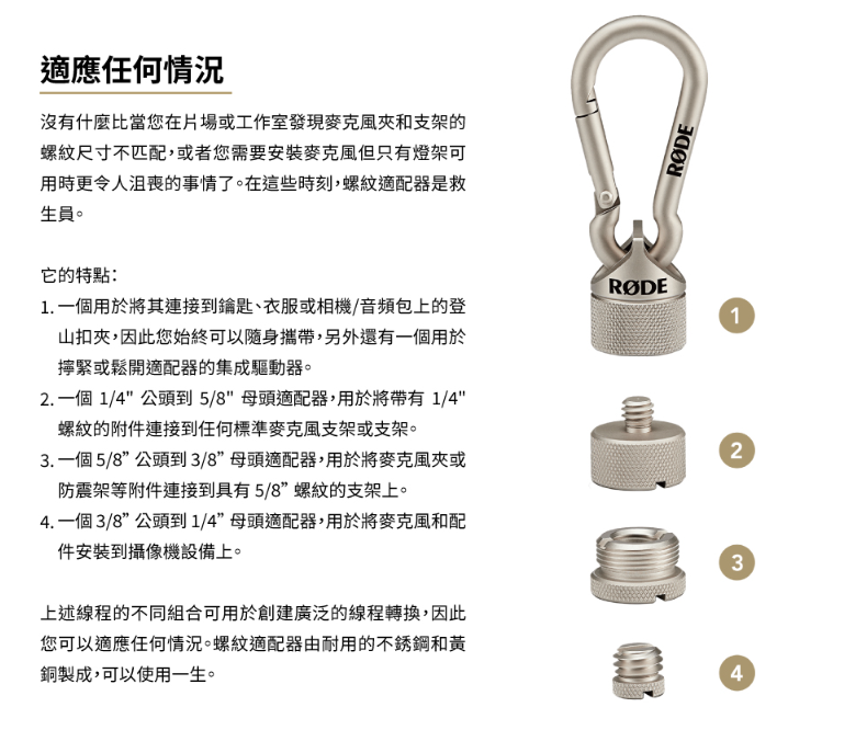 通用螺紋適配器套件,用於將麥克風和其他設備安裝到任何麥克風支架、吊桿、三腳架或工作室臂上